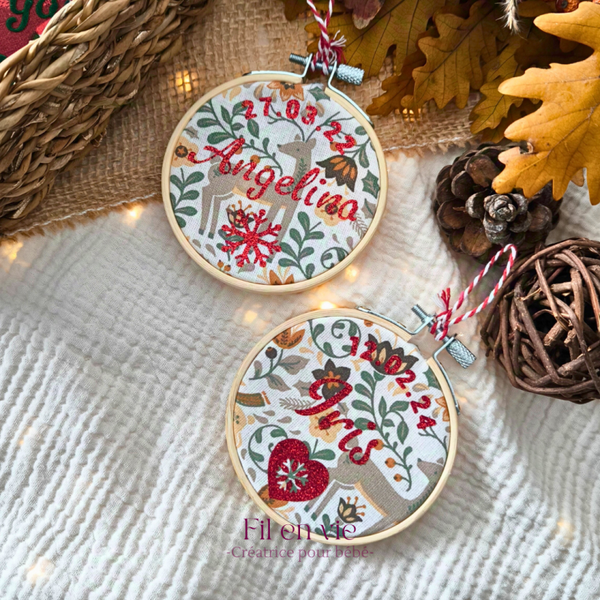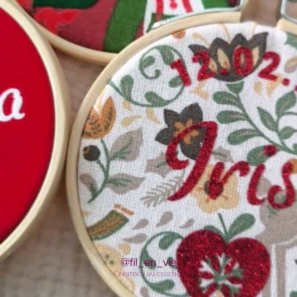 Découvrez la magie de Noël avec le tambour de Noël personnalisée Imaginez une décoration unique pour votre sapin, créée rien que pour vous et votre tout-petit ! Réalisé à partir d’un tambour à broder en bois, vous avez le choix entre plusieurs tissus: - 100% coton uni: blanc, rouge ou vert pour une touche classique - 100% coton à motifs pour une touche plus festive Personnalisez-le avec le prénom de votre bébé, sa date de naissance, et choisissez une petite icône pour rendre cette décoration encore plus spéciale. Pour le flocage, laissez parler votre créativité : rouge ou doré pailleté pour un éclat scintillant, ou encore vert, rouge ou blanc velours pour une finition douce et chaleureuse. Et enfin, ajouter la touche finale en choisissant le fil d'accroche : blanc/rouge ou blanc/vert Ce tambour de Noël ne sera pas seulement une décoration, mais un véritable souvenir chargé d’émotion.