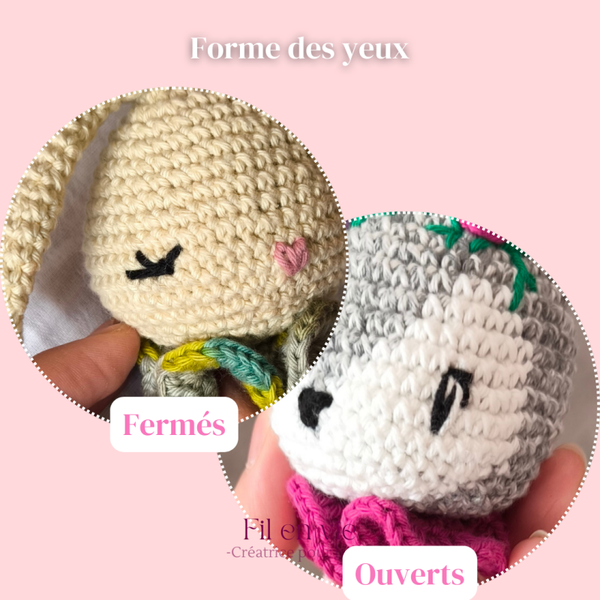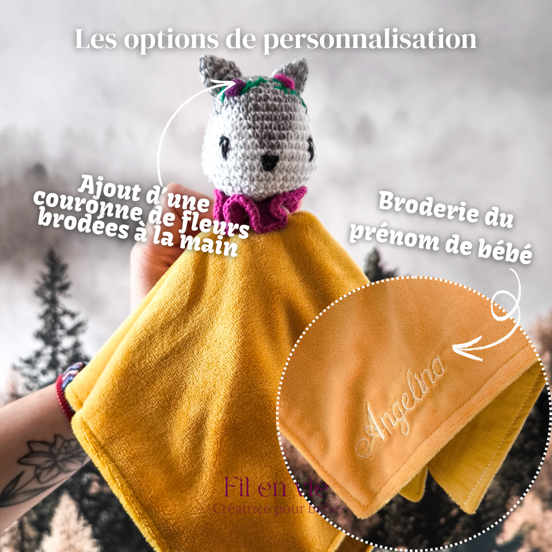 Chaque détail est personnalisable: Choisissez l’animal (Renard, Loup, Ours, Biche, Licorne, Lapin, Coccinelle, Abeille ou même un modèle personnalisé sur demande), les couleurs, la collerette, la couronne de fleurs, le flocage du prénom de bébé, la forme des yeux et même, disposition des tissu (minky sur l'endroit ou sur l'envers).... Ce doudou est un cadeau sur-mesure, pensé spécialement pour vous !