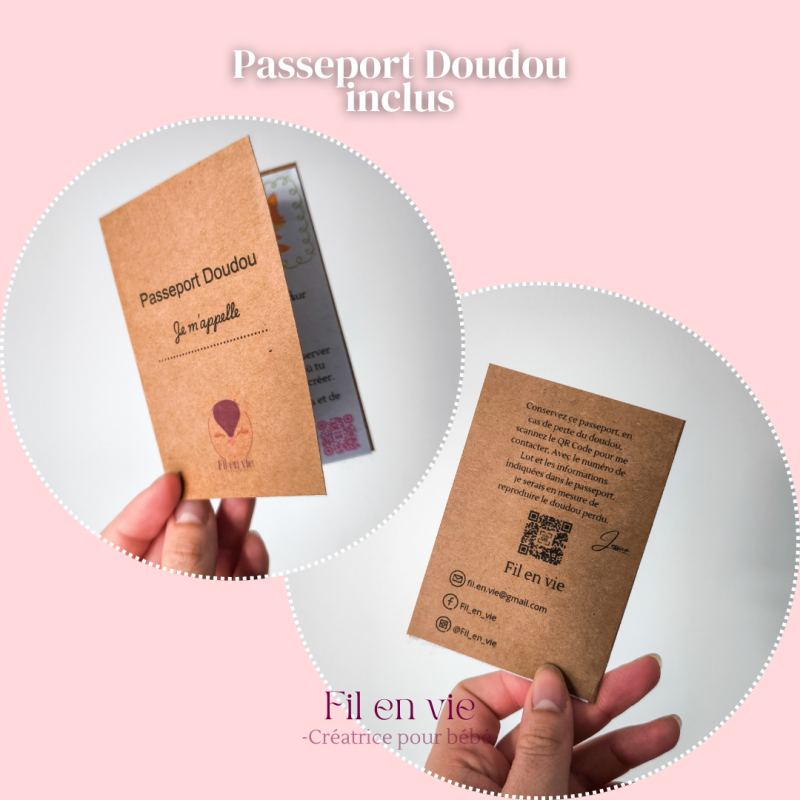 Chaque doudou est accompagné de son Passeport Doudou, un document unique qui répertorie toutes les couleurs et matériaux utilisés.