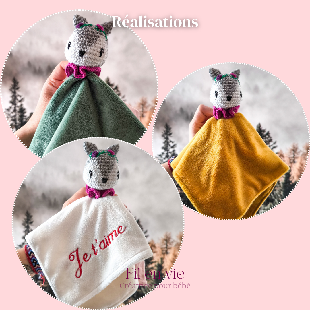 Ce doudou, avec sa tête de Loup crochetée en 100% coton. Avec son tissu minky tout doux, doublé de son lange en double gaze de coton conçu avec soin par une couturière professionnelle, est bien plus qu’un simple doudou, il deviendra vite le meilleur ami de bébé !